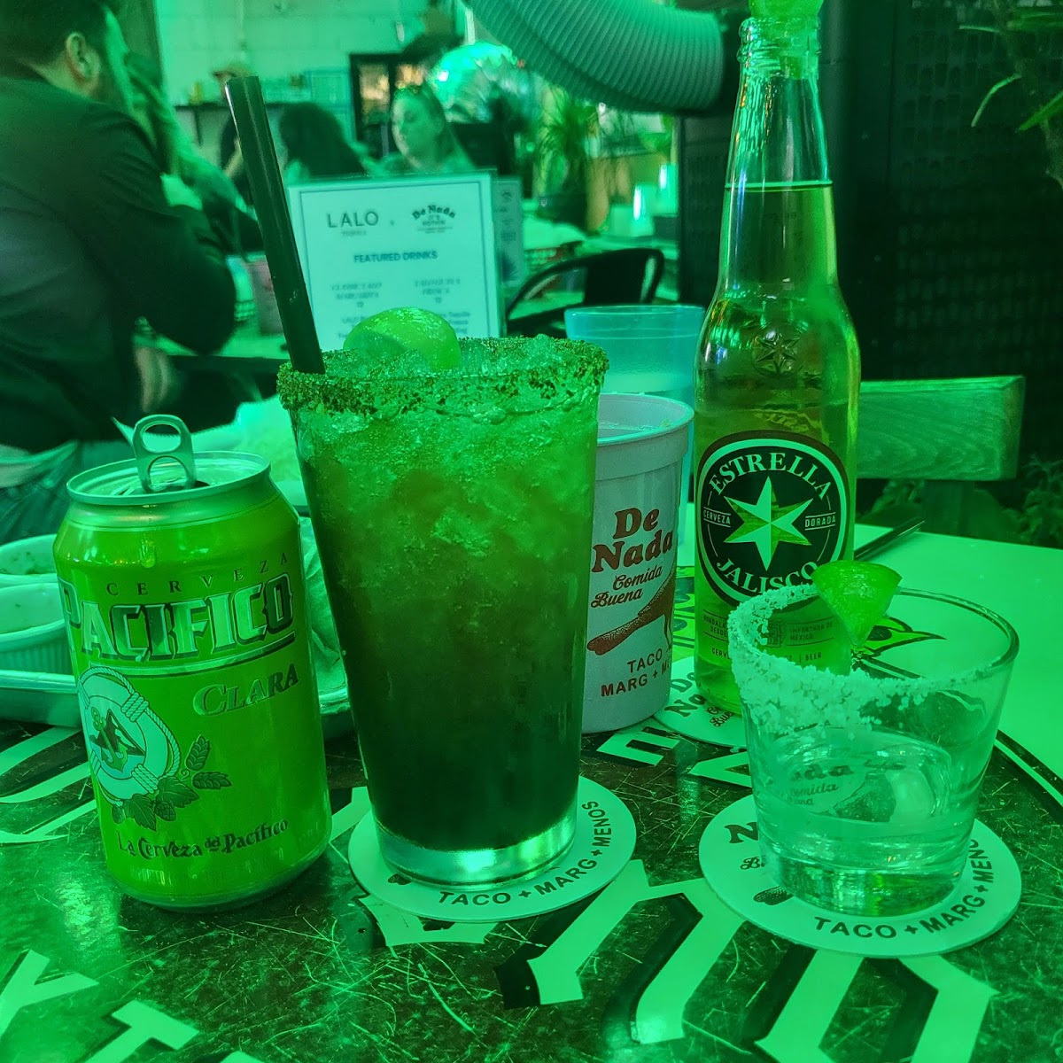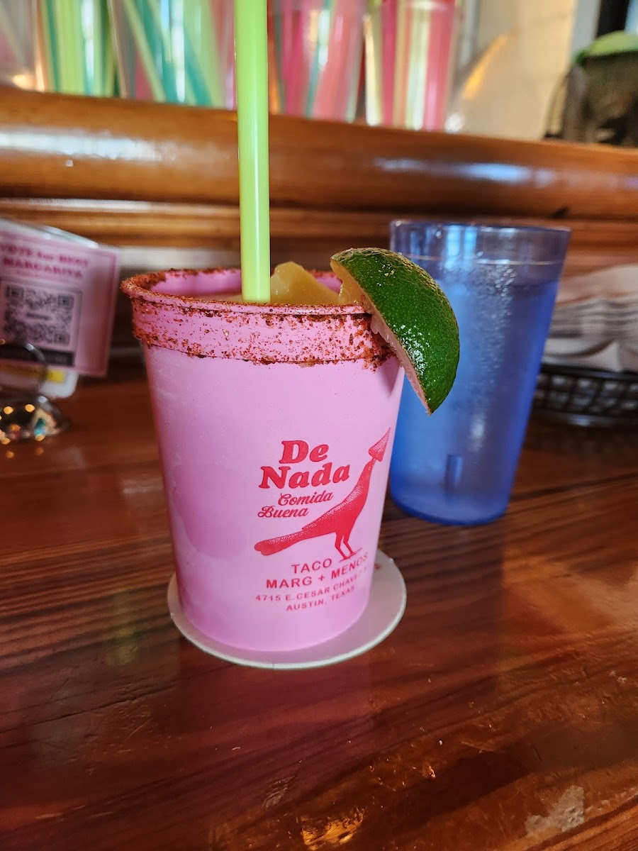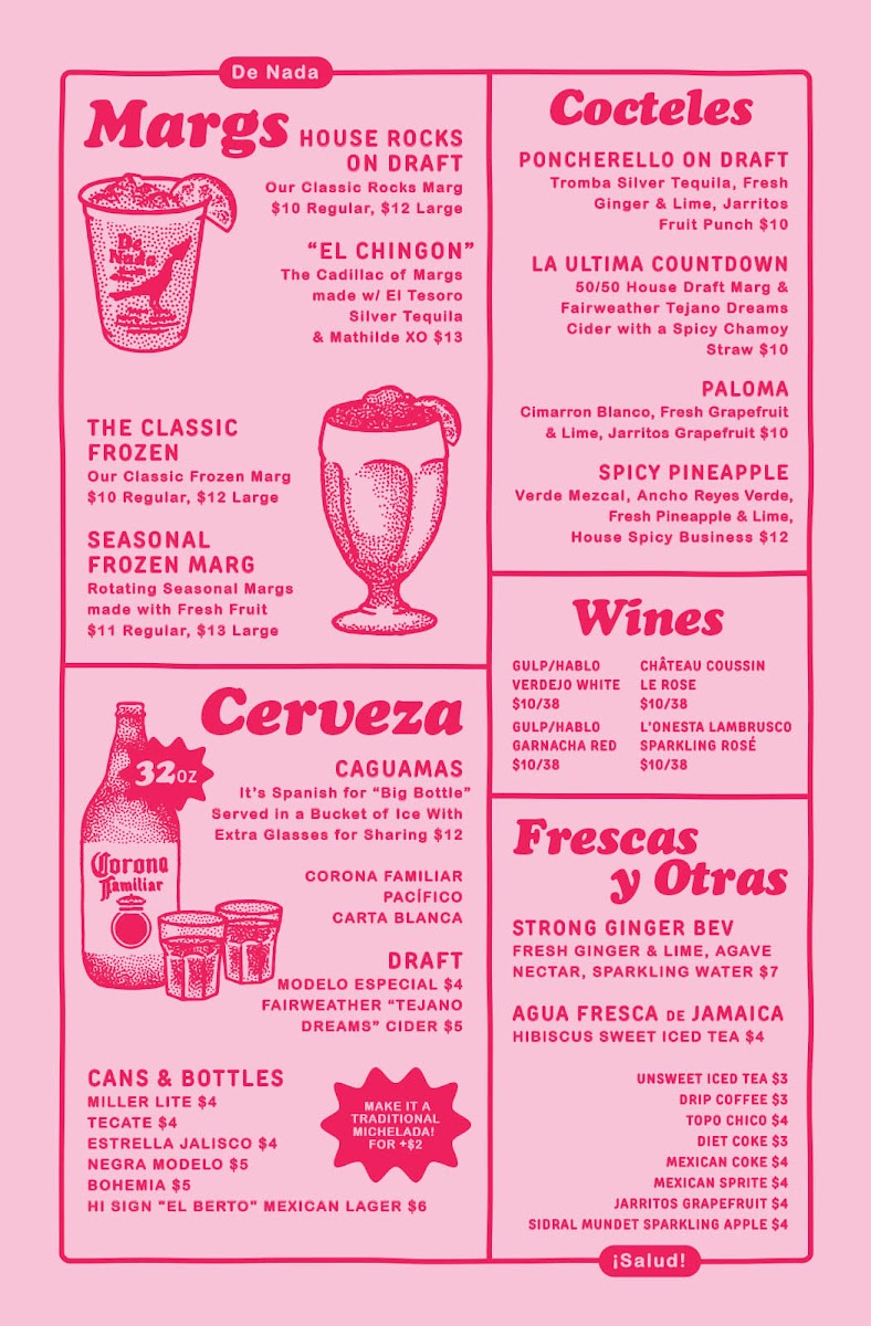 Pair these amazing tacos with one of De Nada’s delectable margaritas. The "El Chignon" is a must-try, boasting El Tesoro Silver Tequila and Mathilda XO for a mere $13.00. The frozen margaritas are a hit as well, with flavors that change with the season—each sip refreshes and delights!